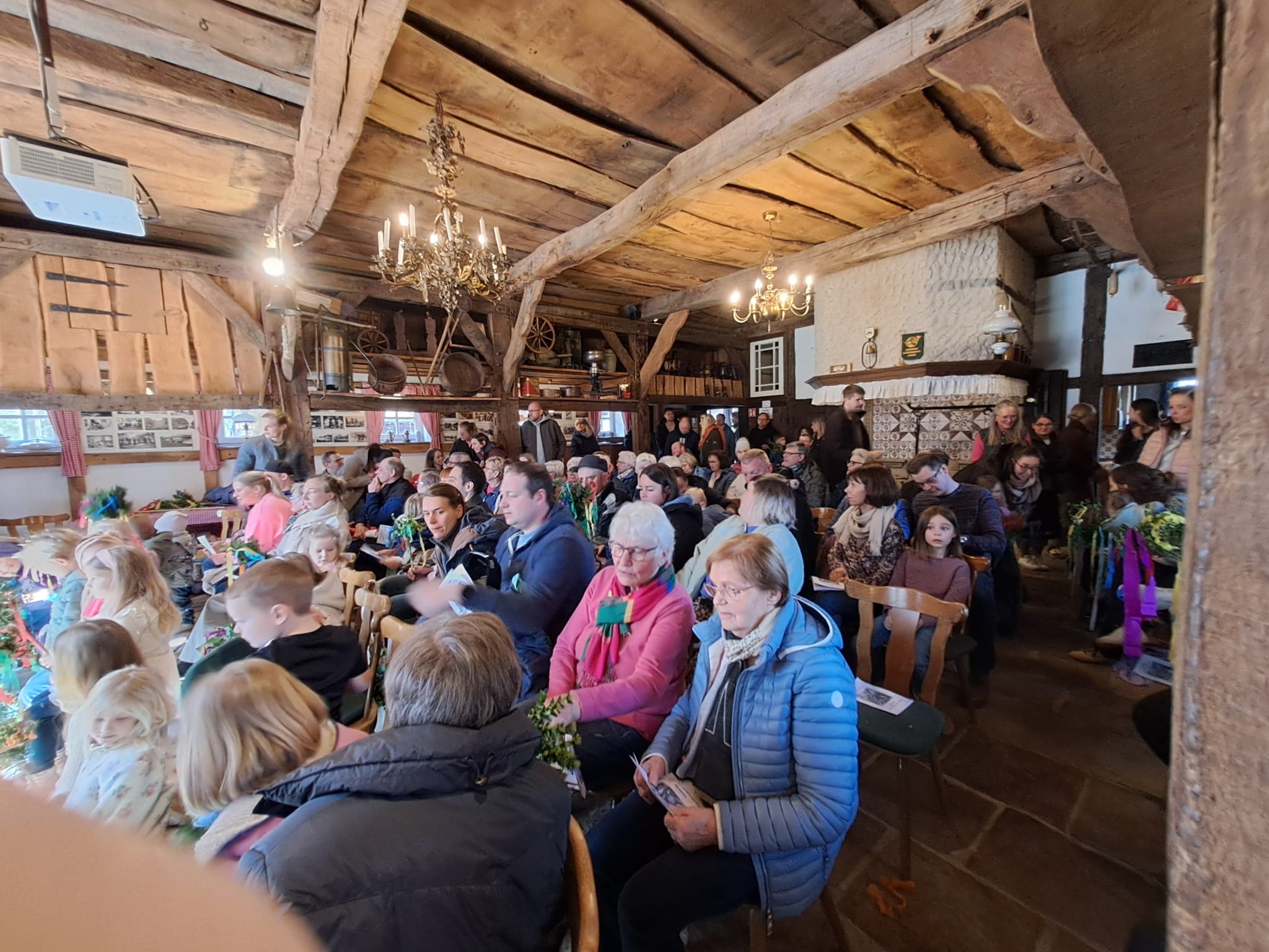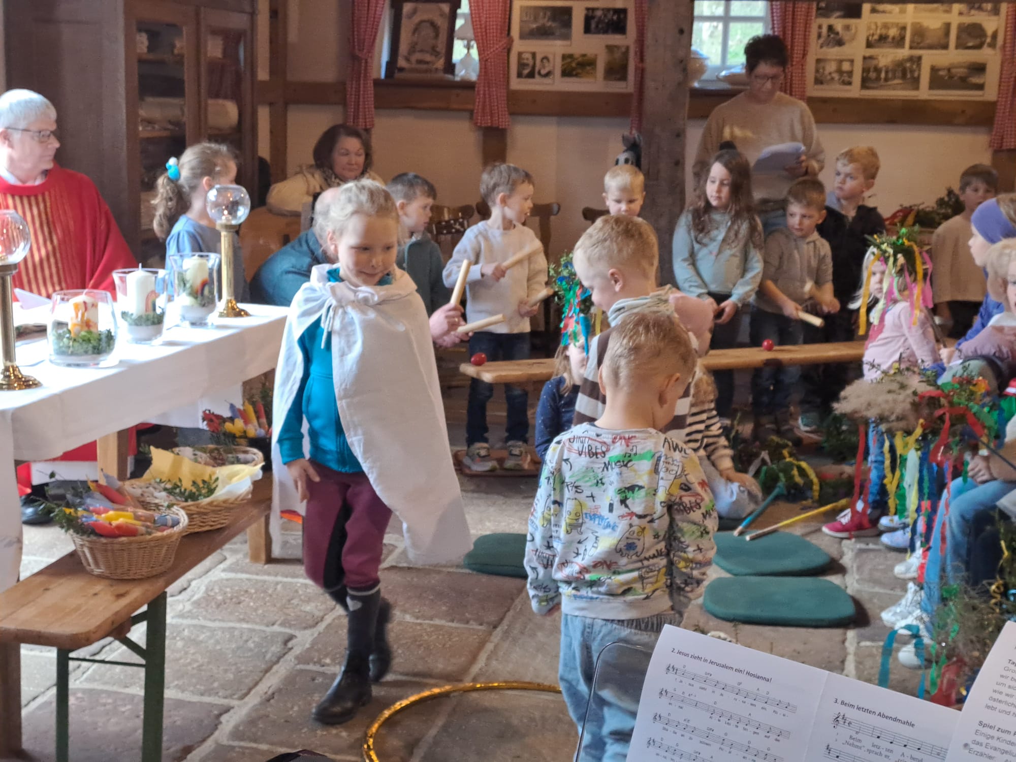 Dort entstand eine besonders warme und gemeinschaftliche Atmosphäre. Eng zusammengerückt erlebten die Besucher eine stimmungsvolle Messe, während die Frühlingssonne durch die großen Tore und die Butzengläser in die Diele fiel. Viele Kinder nahmen auf Matten vor dem Altar Platz und verfolgten aufmerksam das Geschehen.